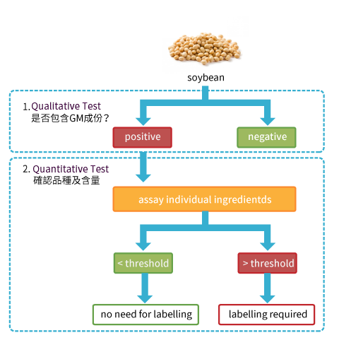 需於上市前通過審核,且產品凡超過5%非刻意混雜容許之基因改造食品必須明顯標示,因此,如有來路不明或未經政府允許上市之商品,我們予提供檢測及定量服